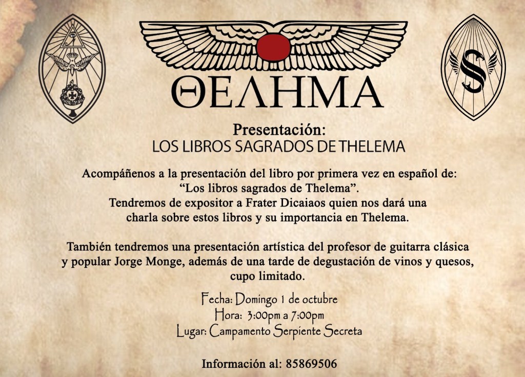 Campamento Serpiente Secreta se complace en invitarlos a nuestra presentacion de los libros sagrados de thelema, a llevarse a cabo en nuestras instalaciones en heredia, Costa Rica.